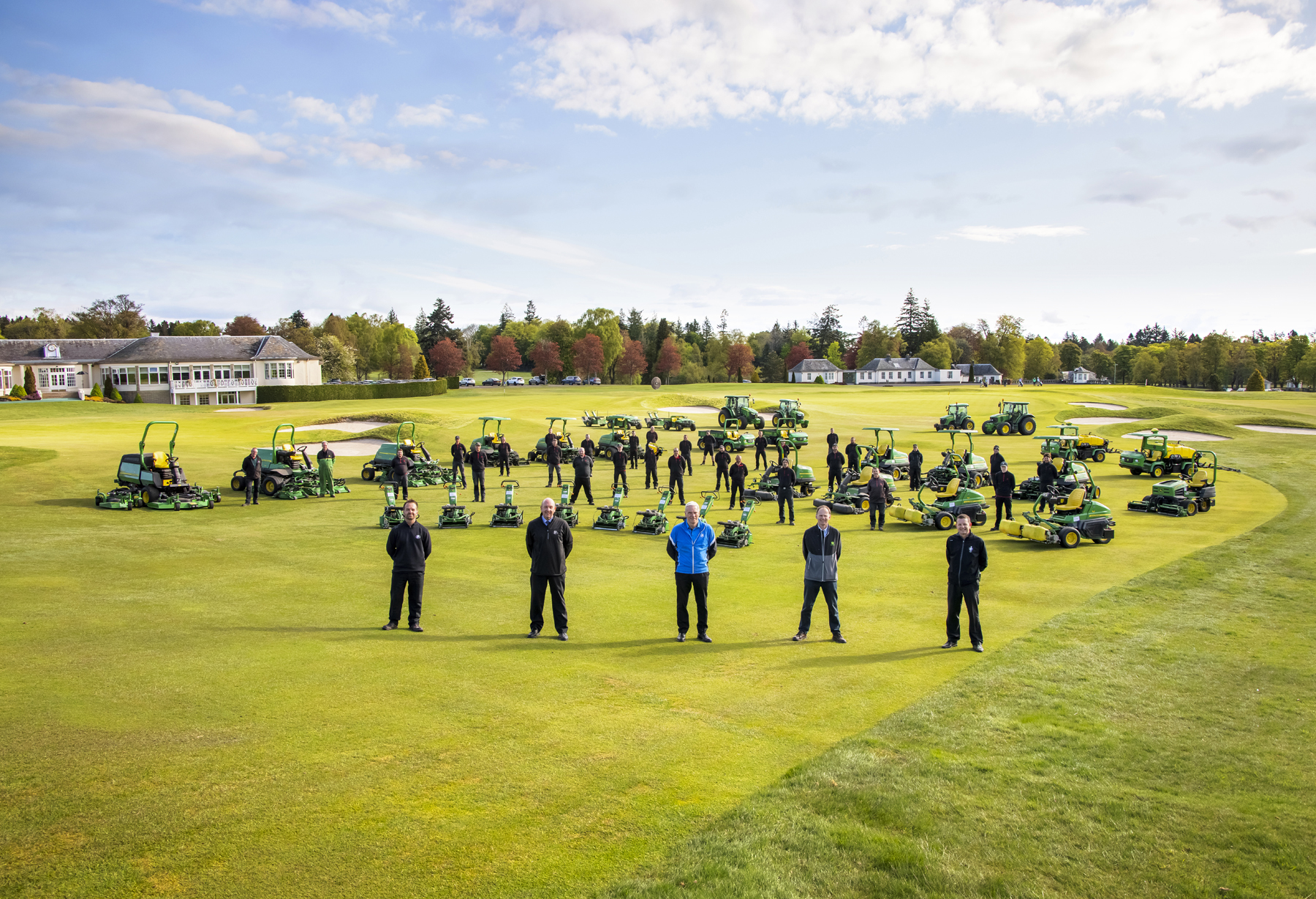Scott Fenwick, Craig Haldane (front centre & right) and members of Gleneagles’ greenkeeping and gardens team with John Deere and dealer Double A staff on the 18th fairway of The King’s Course.